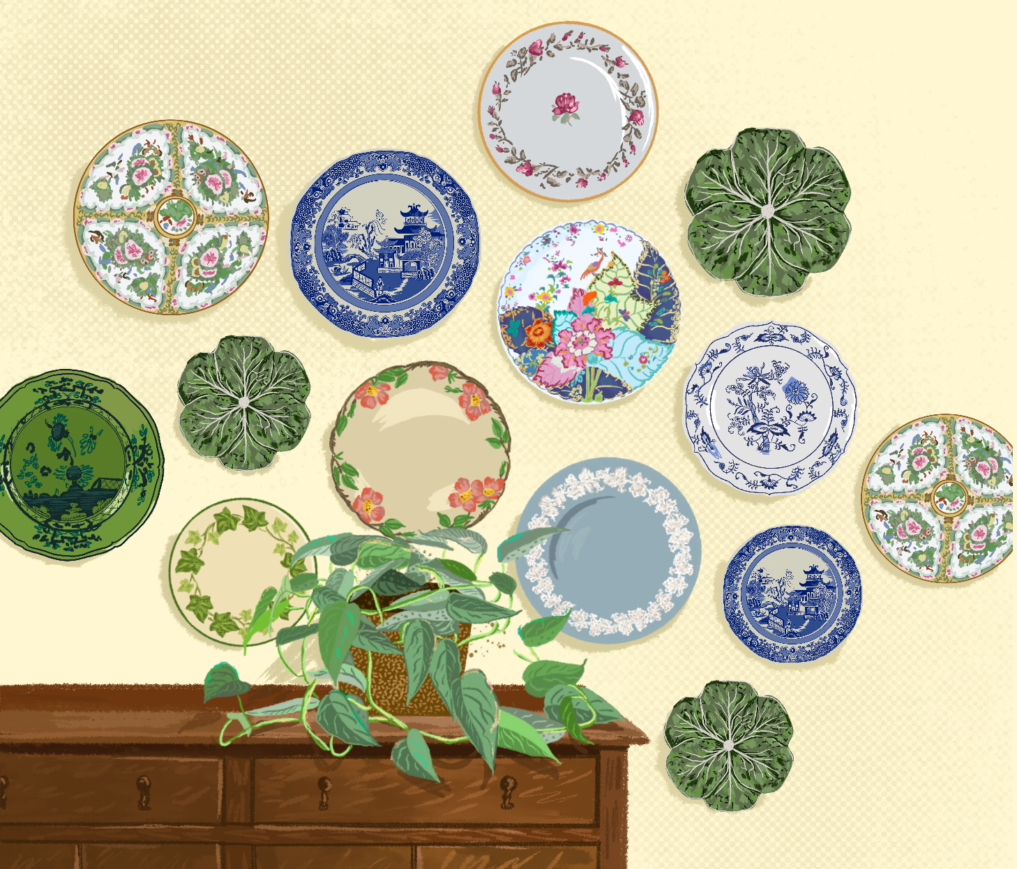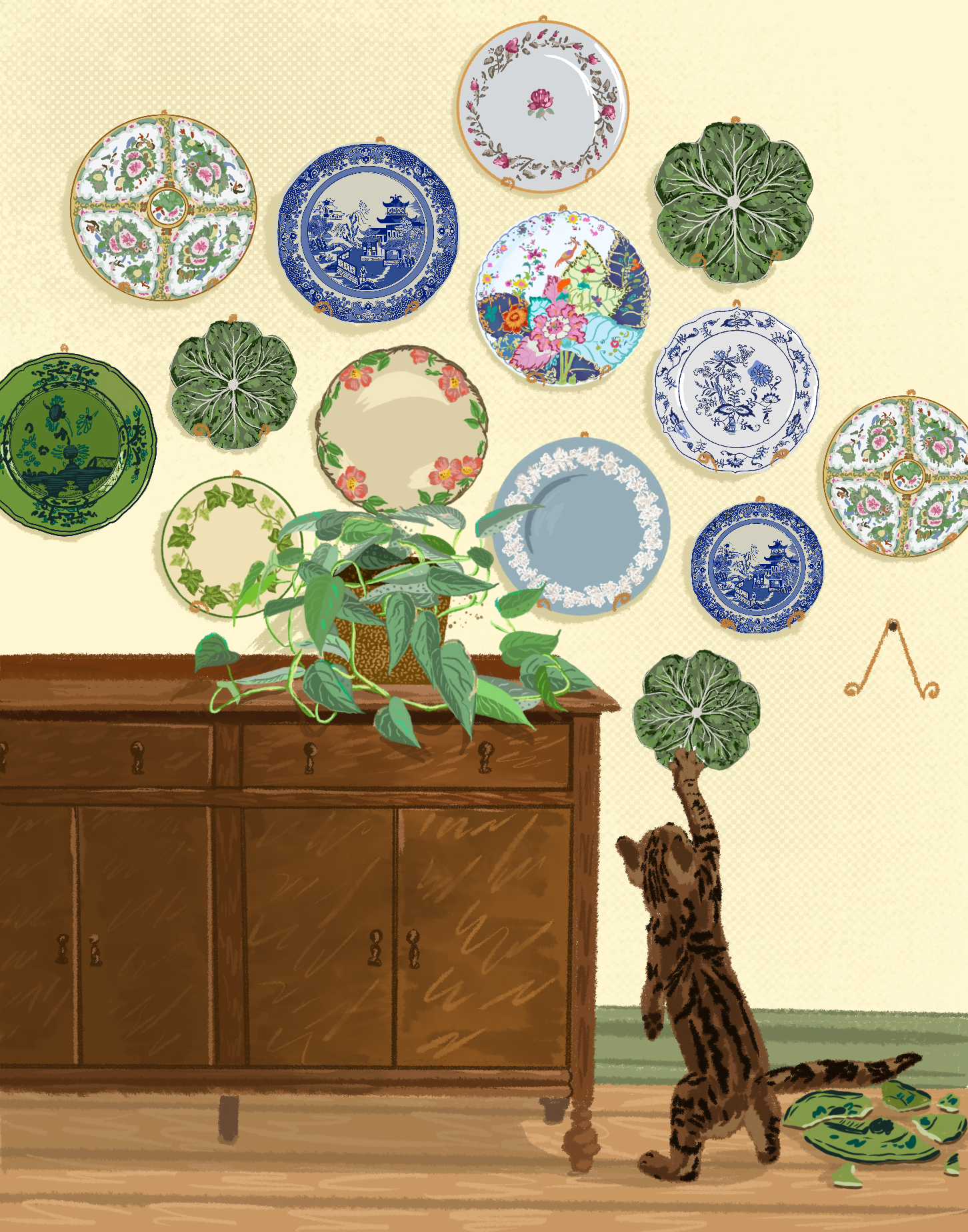 I hand illustrated all of the plates individually and then uploaded them into illustrator on top of my backdrop to play with the layout of the China. The illustration felt lackluster, so I added a michevious cat causing havoc in Granny’s China collection. I like the addition of the cat, it really adds to the grandma vibe of the final version.